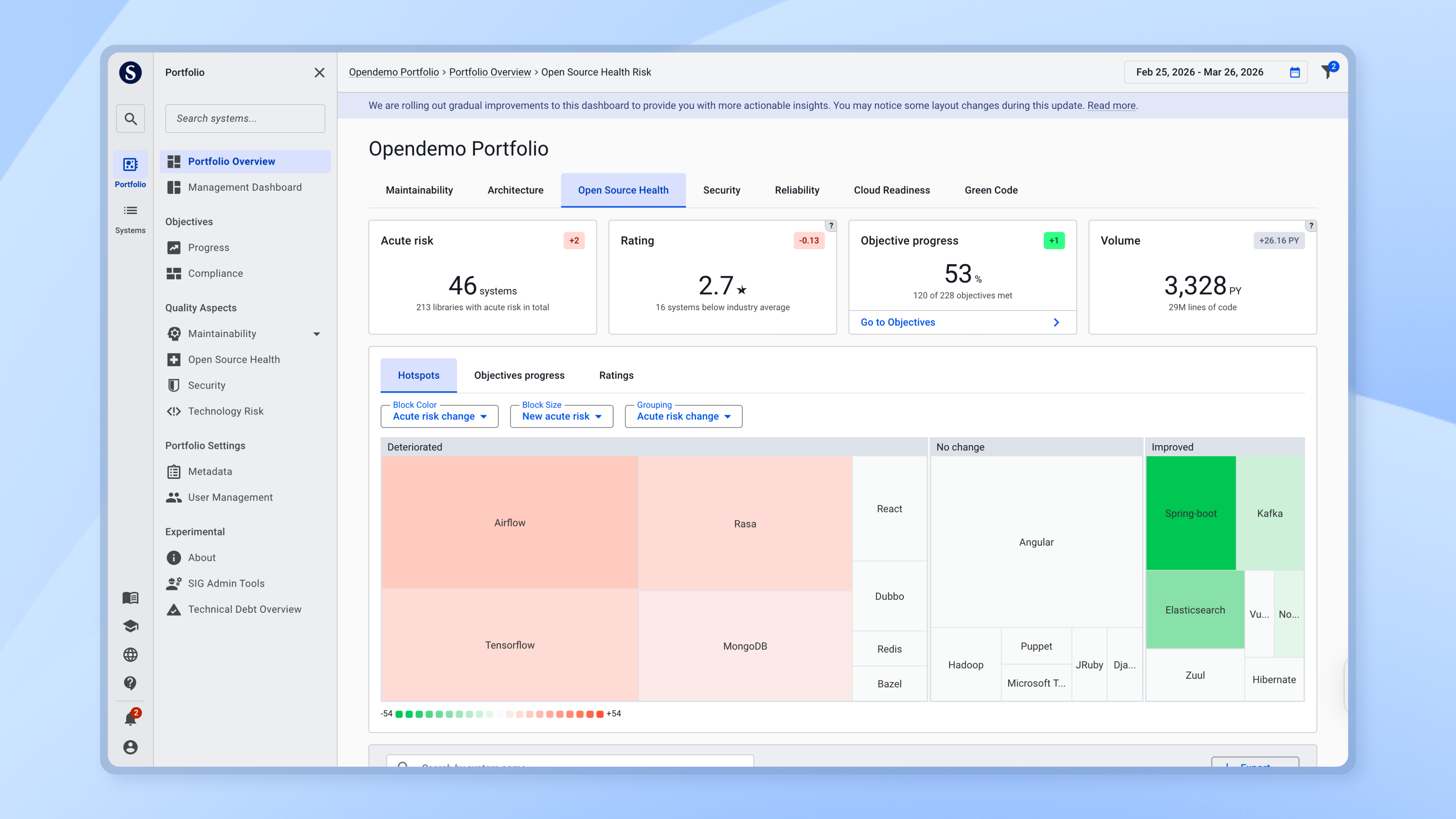The screenshot above shows an example on how Sigrid can help you to define and track objectives for various quality aspects. You can do this for every system in your portfolio. For more context on the relation between systems and their repositories, see systems.