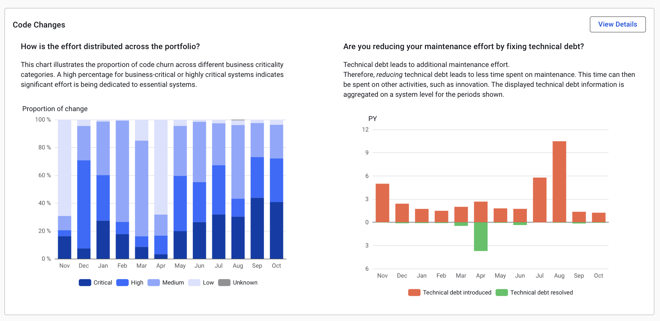 The charts break down development activity by month. The chart on the left illustrates how development effort was allocated based on the business-criticality of your systems.