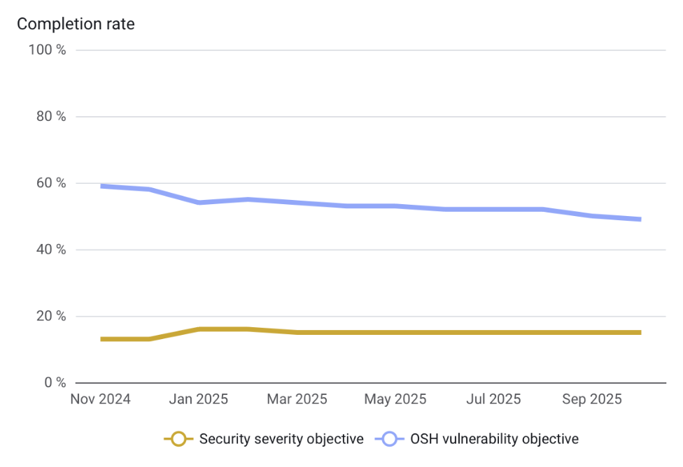 A mature security process should show consistent and predictable patterns, and it does align with general best practices regarding the time to resolve security issues. Compare that with your chart per risk category. For a deep dive, you can always check the security page.