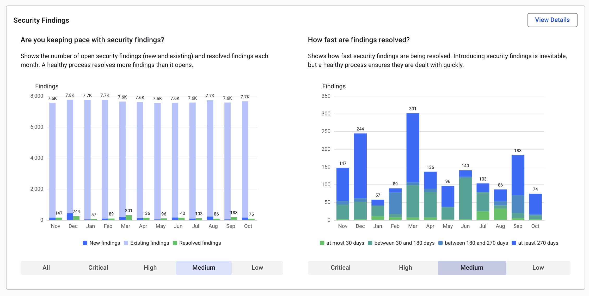 Below that, we have charts showing how status of security findings (new, existing, and resolved) and how quickly your teams are addressing them per severity.