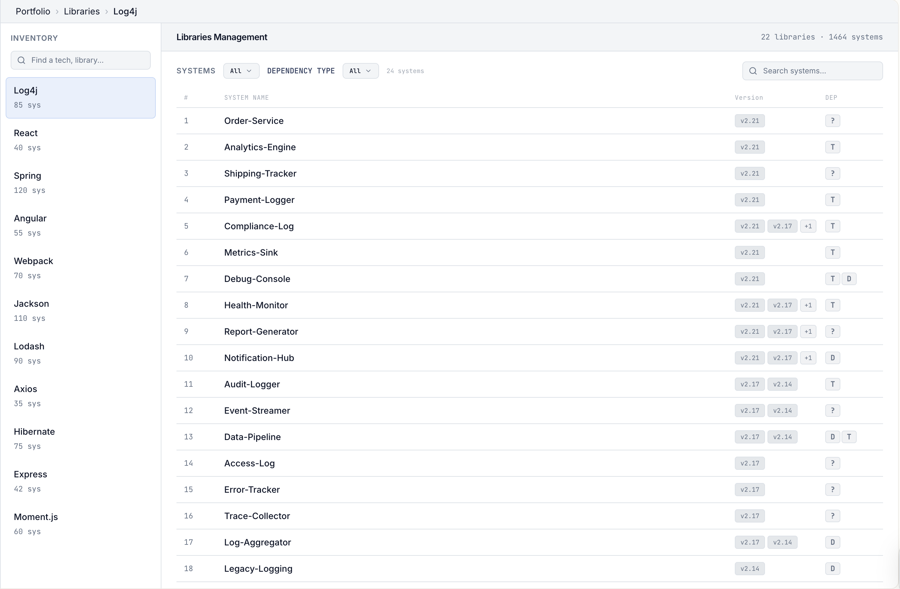 - The system count indicates how many systems currently use a specific open source library (for example, 85 systems in your portfolio use Log4j).