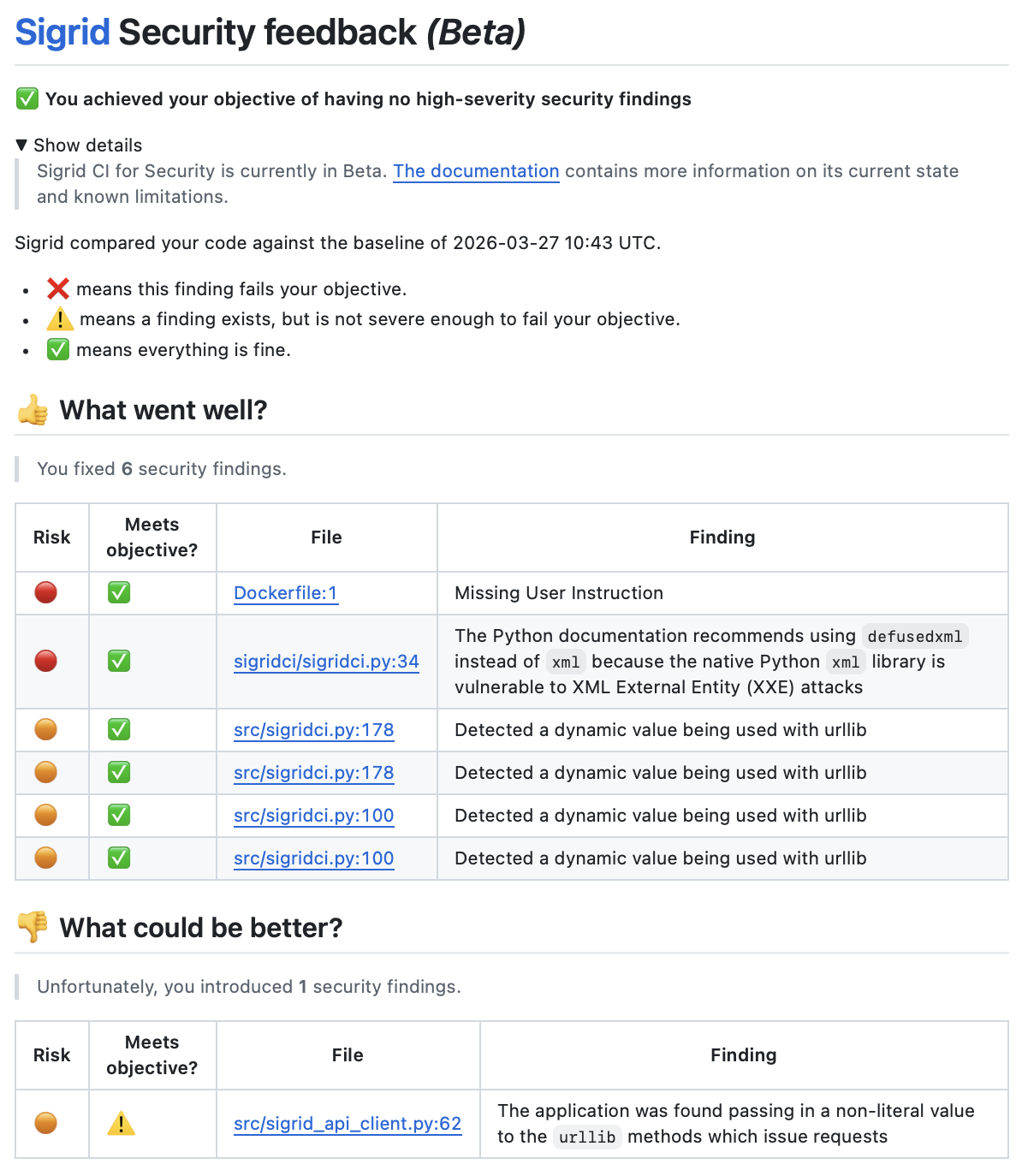 During the Beta phase, Sigrid CI will give feedback on all new findings. That might include situations where your code is not new, but new security findings have been discovered in existing code. We will decide on the final behavior based on feedback we get during the Beta phase, because arguments go both ways: (A) People prefer to only receive feedback on things they did, but (B) new security threats are continuously discovered, and we need to make people aware.